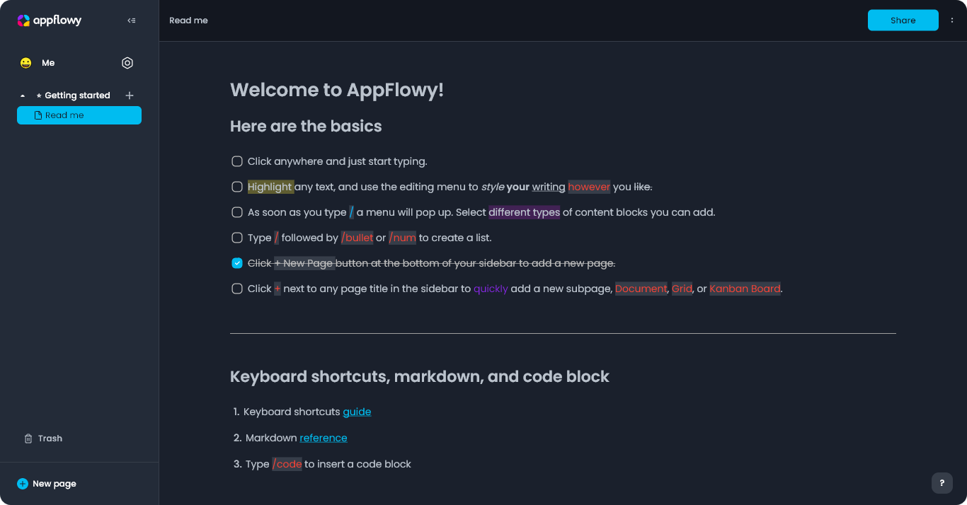 Before we dive into the details, let's talk about the benefits of using Appflowy as a software engineer. First and foremost, AppFlowy helps me stay organized. With its ability to create structured pages, I can keep all my projects, tasks, and notes in one place. Additionally, I can easily share my pages in Markdown(.md file) with my team and keep everyone on the same page.