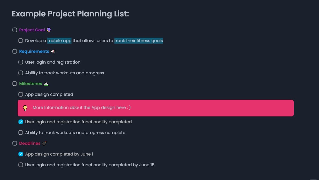 "Development Tasks" helps manage project-specific tasks. Use "Bugs and Issues" to log and address problems, and a "Project Completion" section to track final steps for successful delivery. By creating these sections within your page, you can easily navigate through your projects and find the information you need without any confusion. AppFlowy provides a clean and intuitive interface that allows you to stay focused and organized throughout the software engineering process.