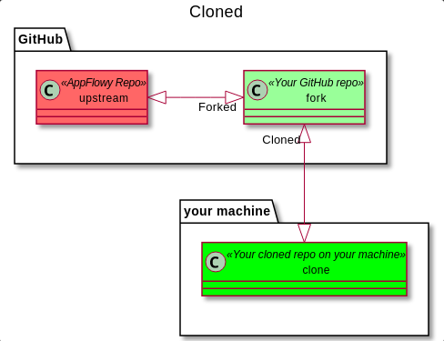 Working on an open source project can get a little complicated for new users. There are 3 code repositories that are involved in the process: AppFlowy's repo, Your GitHub fork, and your cloned repository on your local computer. You can see the location and links between these repositories in the following diagram :