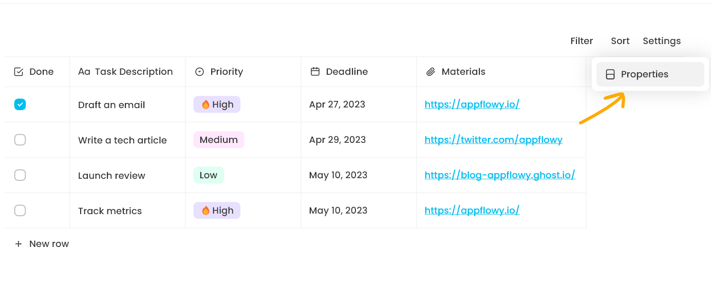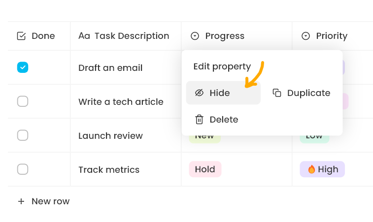 Click on the property name to edit the property. As you can see in the above screenshots, clicking on "Status" will trigger an action menu where you can find "Edit property", "Hide", "Duplicate", and "Delete".
