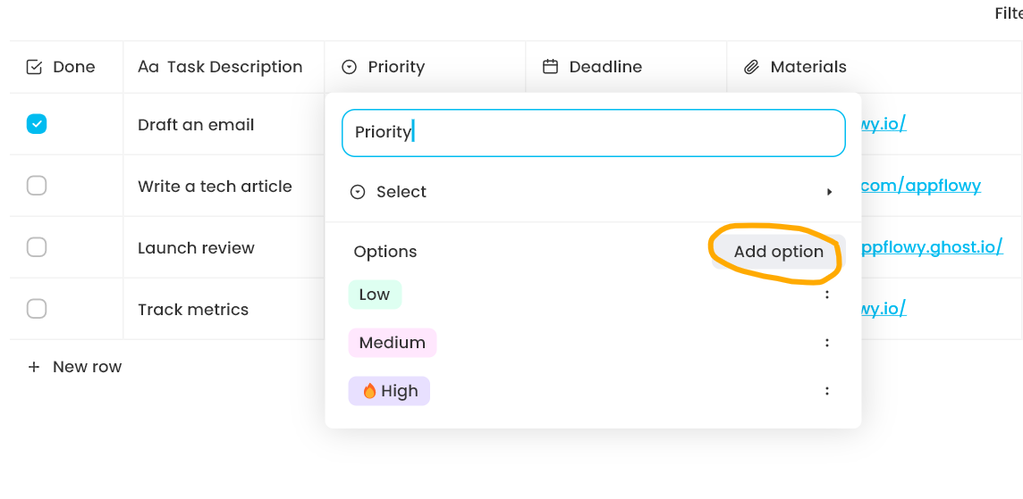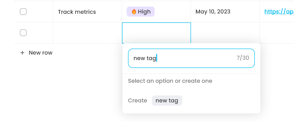 * &#x20;You can also enter a new tag by clicking on a cell under the column, typing what you want, and pressing enter after each. Colors are randomly assigned.