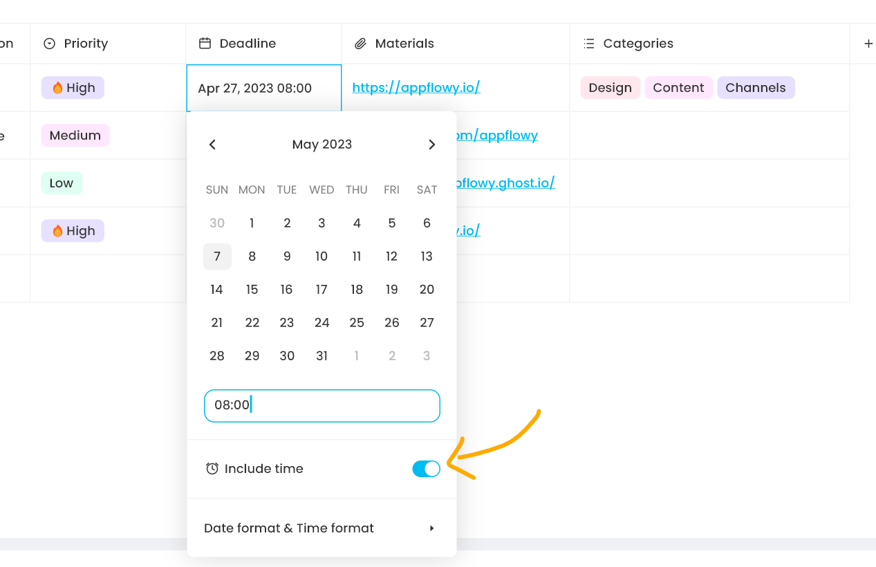 * Toggle on `Include time` to choose an exact time, not just a day.