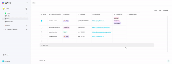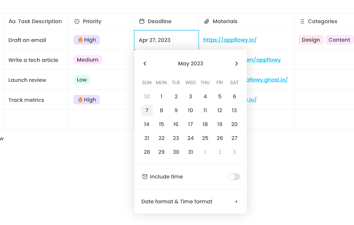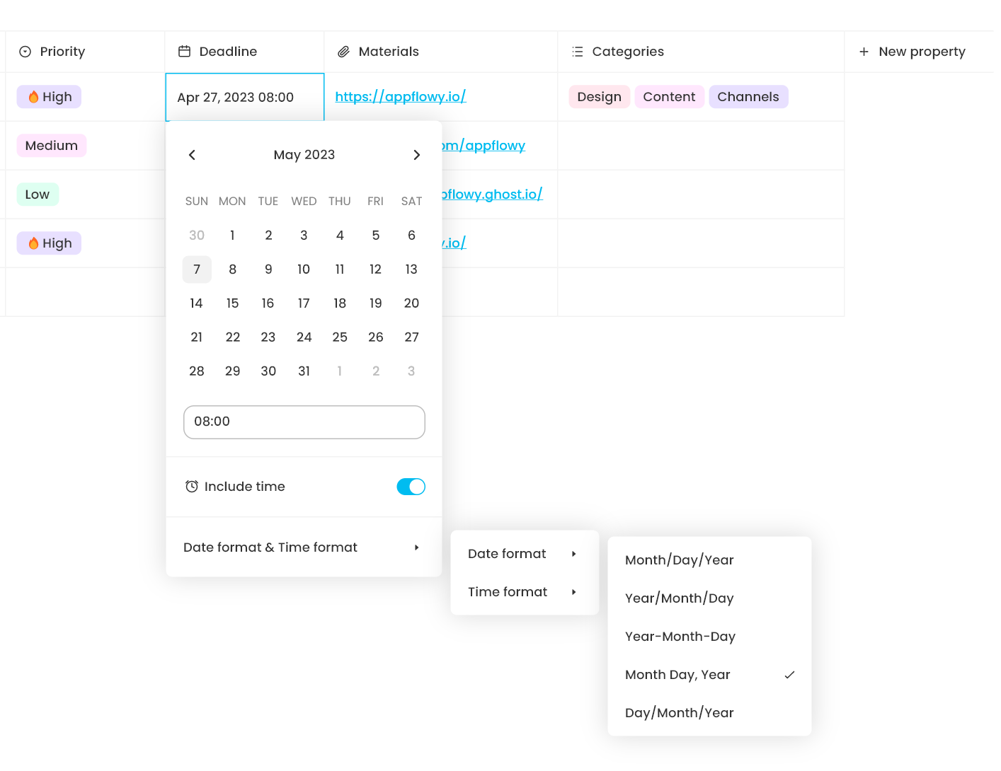 * Clicking to add data will bring up a calendar picker, where you can select the day relevant to the database item — maybe it's a start date or deadline.