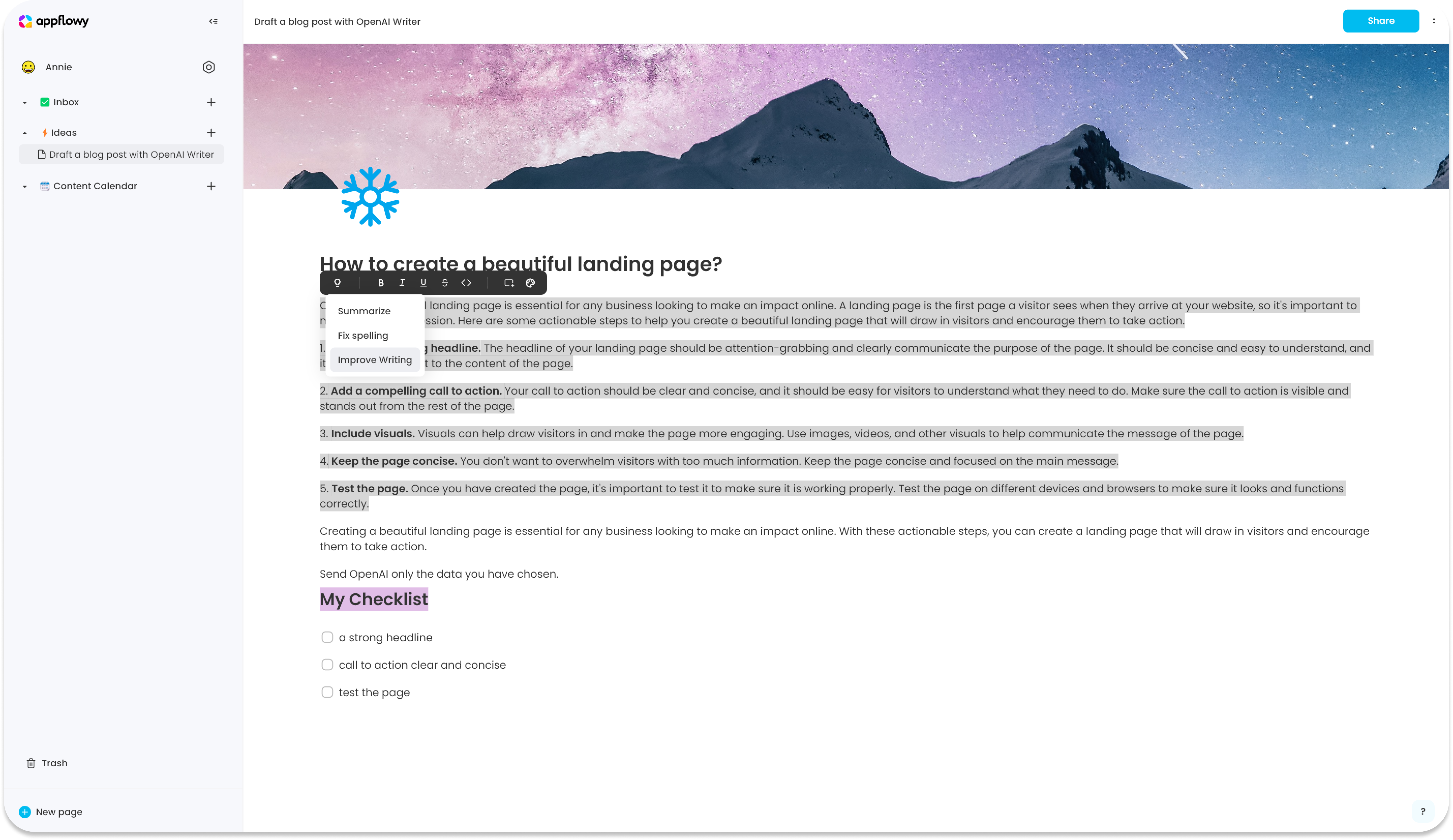 AppFlowy is the first open-source Notion alternative. You are in charge of your data and customizations. Here you can access the complete documentation for AppFlowy.
