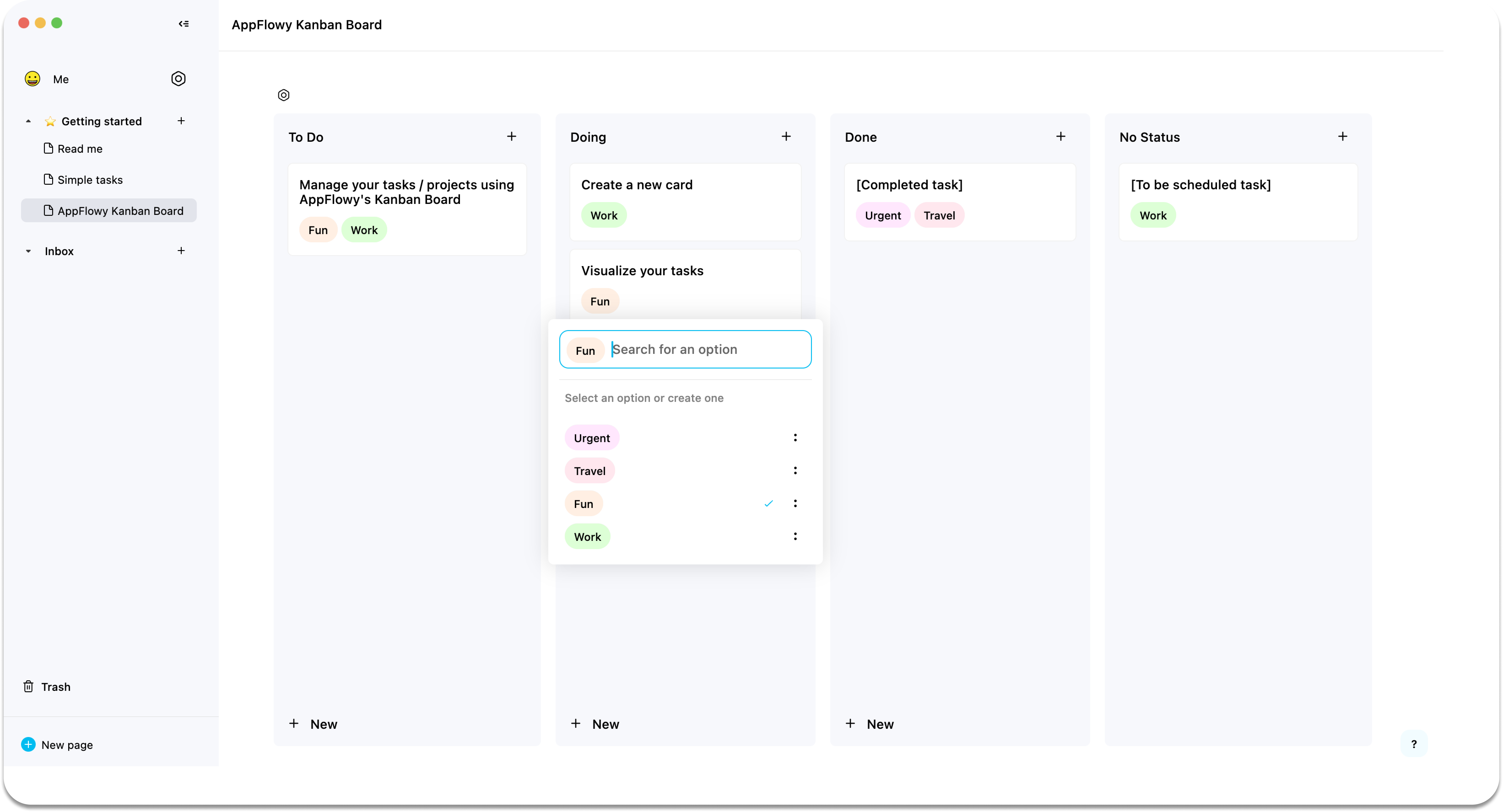 <figure><img src="https://1003959744-files.gitbook.io/~/files/v0/b/gitbook-x-prod.appspot.com/o/spaces%2Fvs4LQcuzr0JR34ApS5sM%2Fuploads%2Fz1X8lpicuDzBS2o6nLiN%2Fappflowy_light_mode_kanban_board.png?alt=media&#x26;token=c3471785-e064-4663-8d65-84e0bfa2aa3f" alt=""><figcaption><p>AppFlowy Kanban Board for To-Dos</p></figcaption></figure>