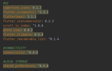 Plugin for checking the latest Pub packages versions. It will automatically run inspection in your pubspec.yaml file to check all dependencies and compare versions with the latest versions from the Pub package repository. The highlighted ones need an update.