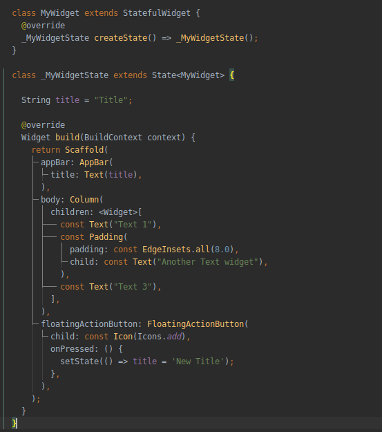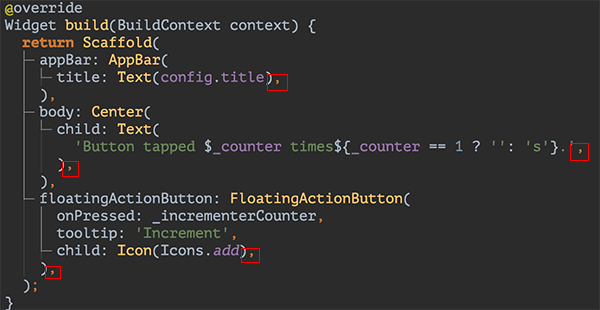 Since your widget tree can grow quickly, you need a way to format your code in a way that makes it easy to read. Adding trailing commas and using your IDE’s formatting shortcuts leads to more readability.